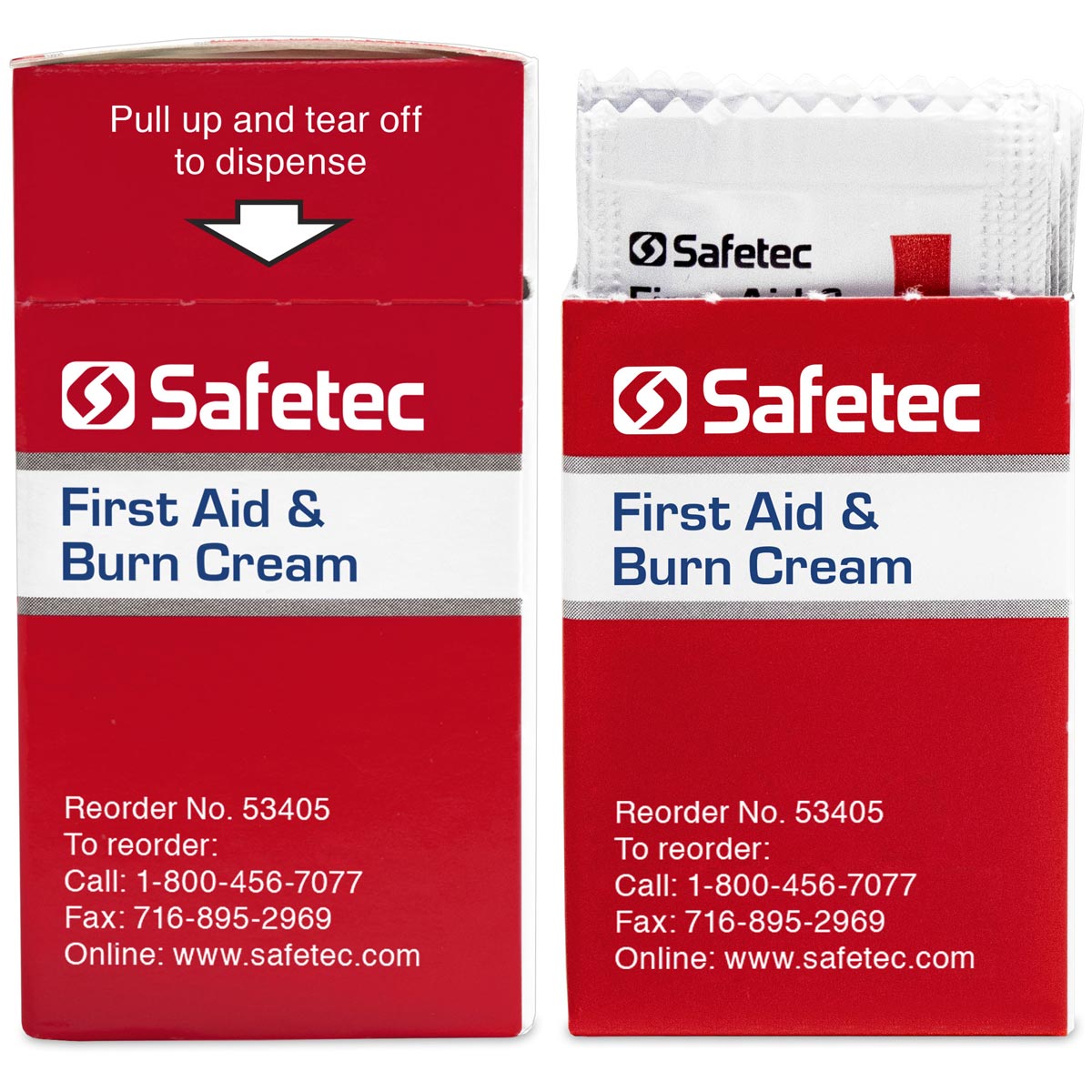 Safetec® First Aid & Burn Cream Helps relieve pain and protects cuts, scrapes and burns against contamination. First Aid & Burn Cream is non-greasy and non-irritating. Keep them in your purse, backpack, pocket or glove compartment. Great for on the spot use at home or at work. Packaged in convenient 25 ct. dispenser box. Contains: Benzalkonium Chloride and Lidocaine HCL.