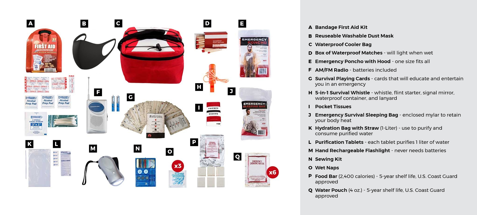 All items are packed securely in our Cooler Bag. Individual components are placed in waterproof bags and neatly organized in the cooler bag for easy access. Hand-assembled in the USA. The kit includes the following: Food and Water: The food and water in this kit have a 5-year shelf life.